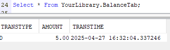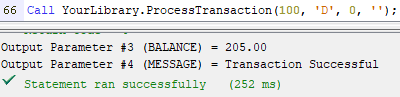 BALANCEparameter is an output parameter of typeDECIMALthat will hold the resulting balance after the transaction is processed. - OUT MESSAGE CHAR(35): The