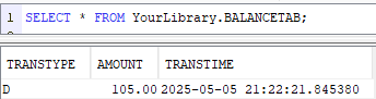 TTYPEparameter is a 1-character input. This could represent the type of transaction (e.g., ‘D’ for deposit, ‘W’ for withdrawal). - OUT BALANCE DECIMAL(15, 2): The